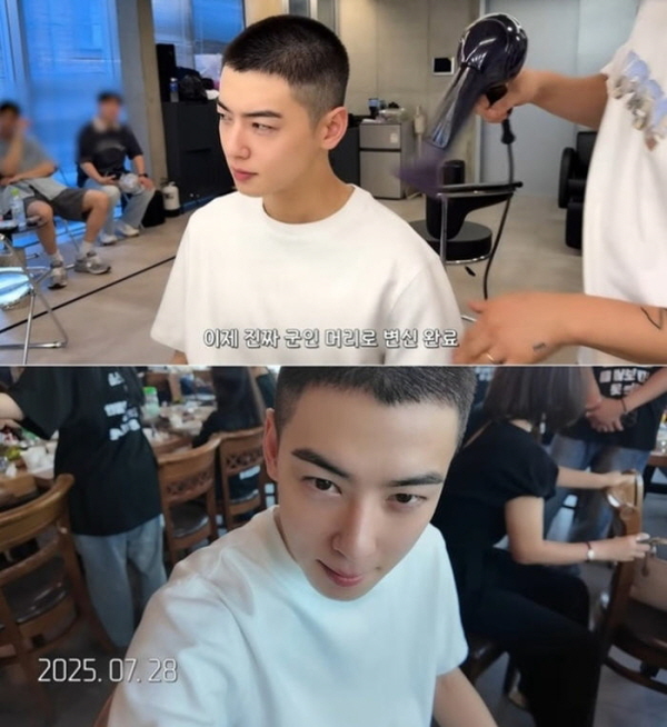 이어 7월 28일 입대 하루 전 반삭 머리로 변신한 차은우는 “내 두피가 이렇게 생겼구나, 너무 신기하다”며 웃어 보였다. 멤버들과 함께 찍은 단체 사진에서는 “연예인 차은우가 아닌 일반인 이동민으로서 생활을 하고 올텐데 걱정도 되고 (아직) 잘 모르겠지만 몸, 마음 다치지 않게 잘 다녀오겠다”고 전했다.