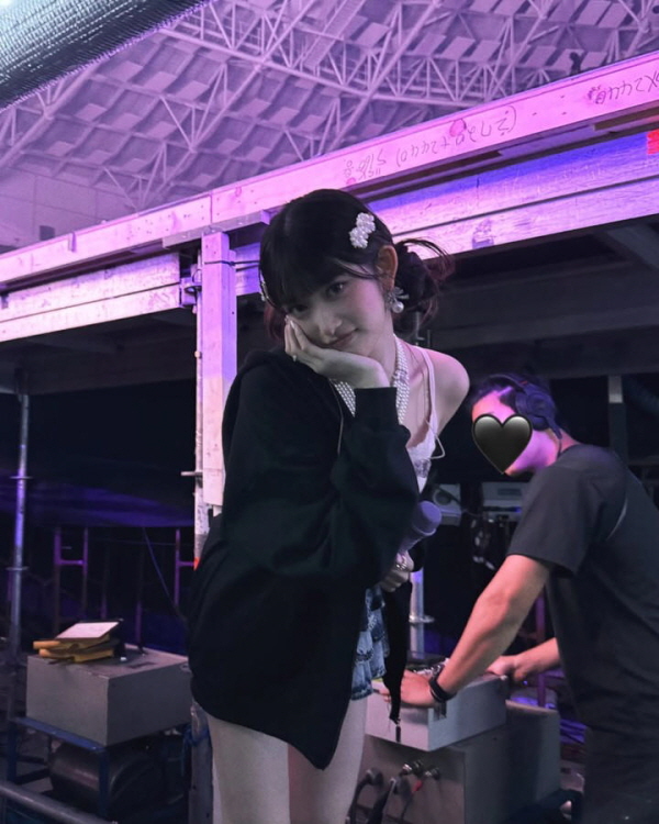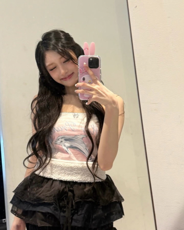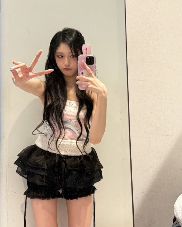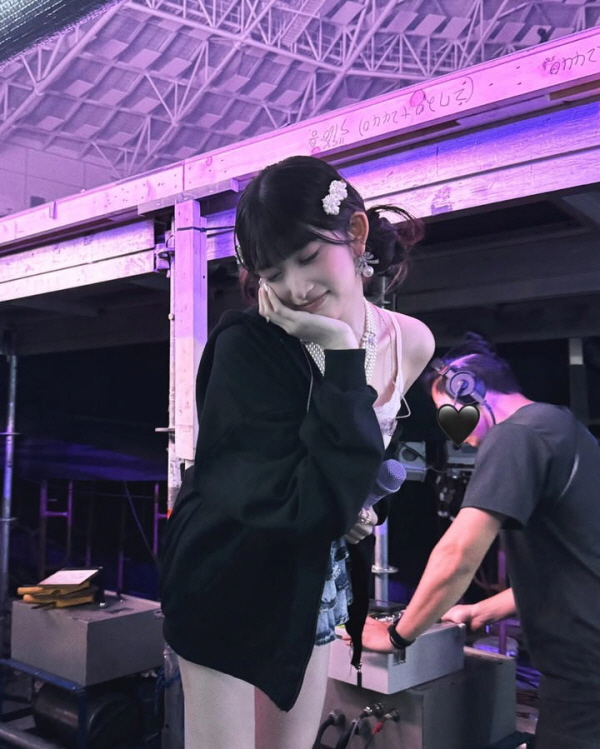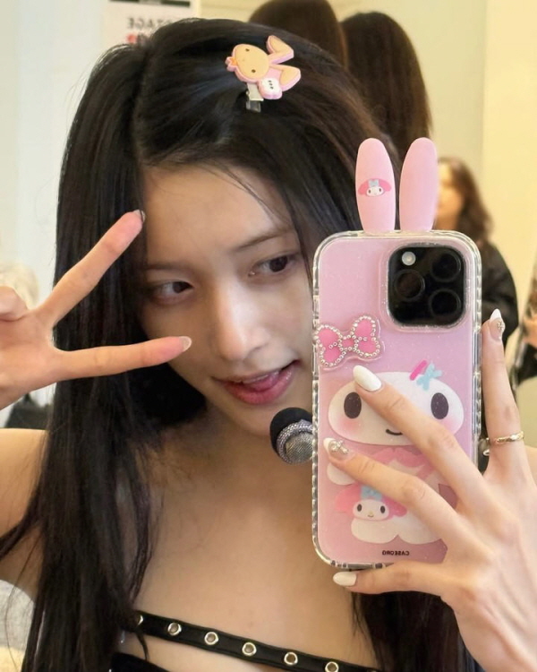 또 다른 컷에서는 하얀 민소매 톱에 리본 액세서리, 토끼 모양 휴대폰 케이스로 포인트를 더해 러블리한 소녀 감성을 자랑했다. 이어 무대 백스테이지 사진에서는 블랙 스트랩 탑에 실버 주얼리를 매치, 이전과는 전혀 다른 시크한 분위기를 자아냈다.