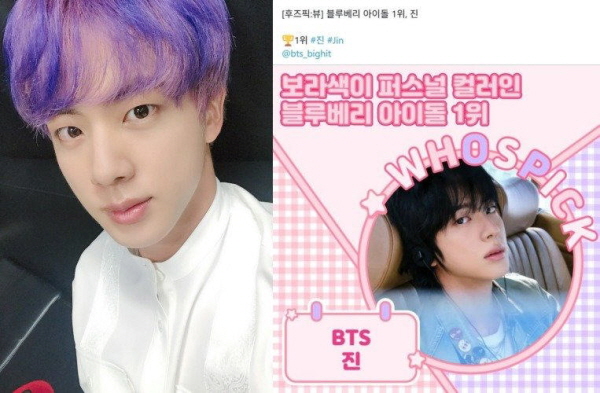 보라색은 대개 어렵다. 차갑고 뜨거운 결이 동시에 스며 있는 까다로운 색이라, 얼굴과 조화를 이루기 쉽지 않다. 그러나 방탄소년단(BTS) 진만큼은 이 난도를 자연스럽게 넘는다. 글로벌 팬덤 플랫폼 후즈팬의 ‘블루베리 아이돌’ 설문에서 진이 42.82%로 1위에 오른 순간, 팬들이 오래전부터 말해온 ‘보라색의 주인’이라는 표현이 설득력을 다시 얻었다.