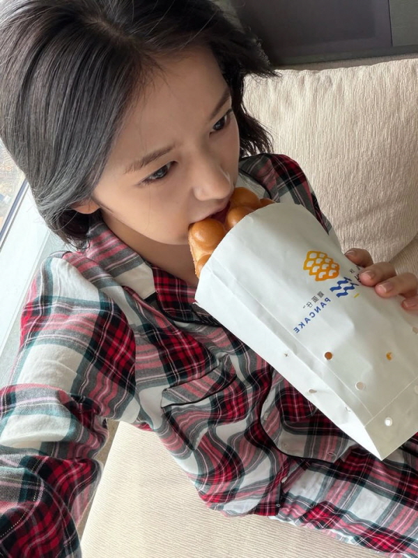 특히 체크 파자마 차림으로 간식을 베어 물고 있는 사진과 민낯에 가까운 클로즈업 샷에서는 잡티 하나 없는 피부와 또렷한 눈매가 돋보인다.
