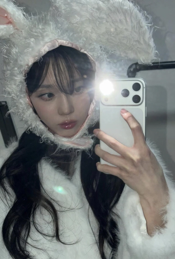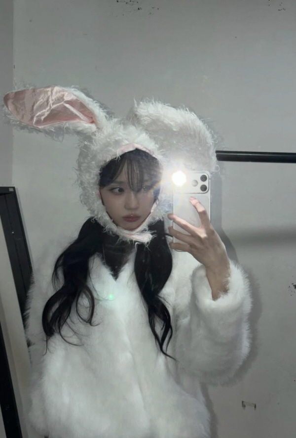 공개된 사진 속 윈터는 토끼 인형탈을 쓴 채 거울 앞에서 셀카를 찍고 있다. 흰색 퍼 코트를 걸친 모습은 전체적인 분위기를 더욱 부드럽고 포근하게 만들었다.