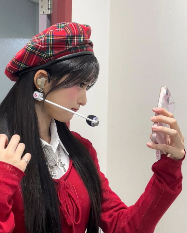 사진 속 이서는 체크 패턴의 붉은 베레모를 곱게 눌러쓰고 긴 생머리를 정갈하게 내려 자연스럽게 어깨를 타고 흘러내리게 했다. 선명한 붉은색 가디건은 리본 디테일로 포인트를 더했고, 안쪽의 흰 셔츠와 실버 톤의 십자가 목걸이가 레이어드돼 겨울 무대에 어울리는 클래식한 소녀룩을 완성했다.