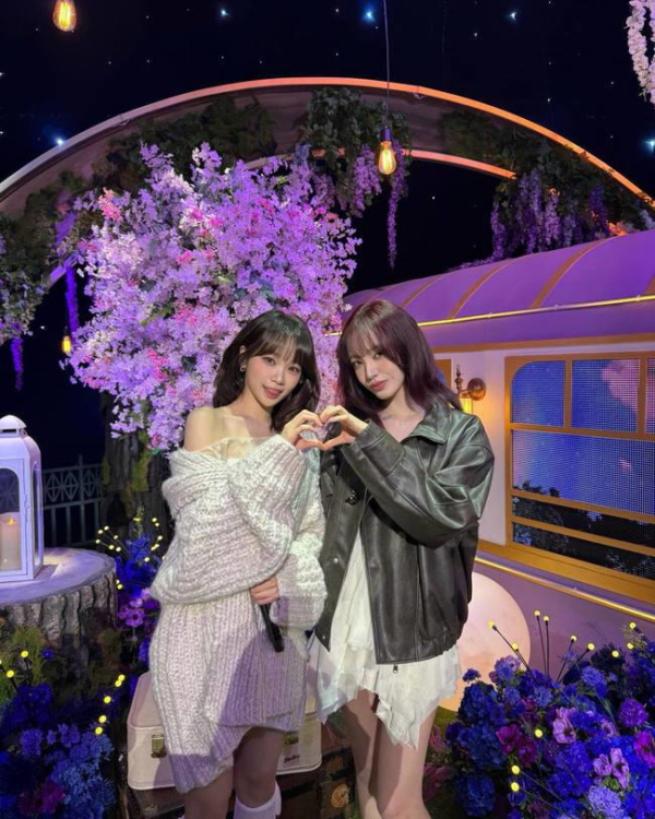 화사한 꽃장식으로 채워진 무대에서 리즈는 인형 같은 미모를 뽐냈다. 이날 ‘네버 엔딩 스토리’를 열창한 리즈는 함께 컬래버레이션 무대를 꾸민 르세라핌 김채원과 손하트 포즈를 취하며 다정한 모습을 보였다.