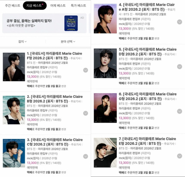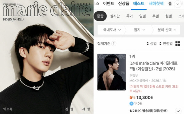 방탄소년단(BTS) 진이 커버 모델인 마리끌레르(Marie Claire) 2월호는 예약 판매 시작과 함께 7종 모두 알라딘 잡지 베스트셀러 1위부터 7위까지 차지하며 큰 인기를 보였다.