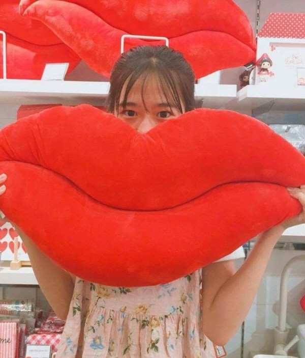 또 다른 사진에서는 매장으로 보이는 공간에서 커다란 빨간 입술 모양 쿠션을 얼굴 앞에 든 장난기 어린 포즈도 공개했다.