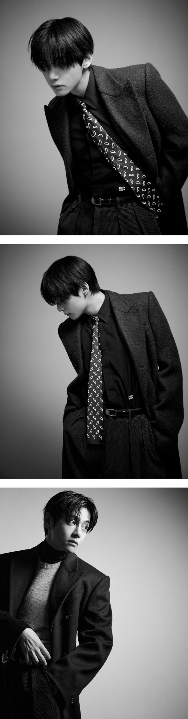공개된 화보 속 뷔는 클래식 슈트를 입고 등장했다. 고전 영화의 한 장면을 연상시키는 분위기 속에서 시대를 초월한 비주얼을 드러내며 시선을 끌었다. 절제된 눈빛과 표정 연기는 셀린느가 지향하는 브랜드 아이덴티티를 자연스럽게 담아냈고, 무채색 위주의 스타일링 역시 뷔 특유의 분위기와 어우러져 강한 인상을 남겼다.