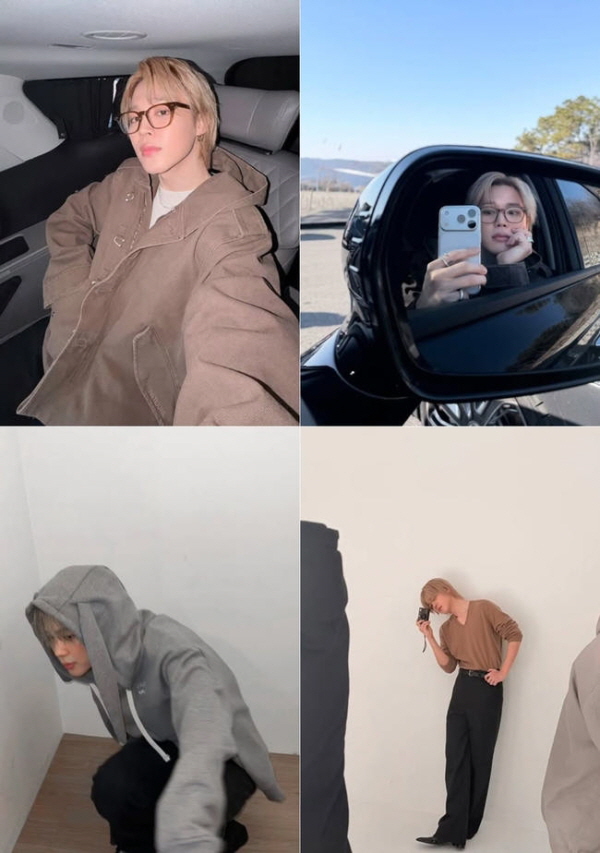 이와 함께 공개한 사진에는 지민이 컴백을 앞두고 물오른 미모를 자랑하는 모습이 담겨 있다. 뿔테 안경도 멋스럽게 소화했다.