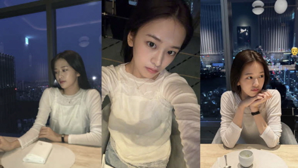 공개된 사진 속 안유진은 도시 야경이 내려다보이는 레스토랑에서 여유로운 시간을 보내는 모습이다.