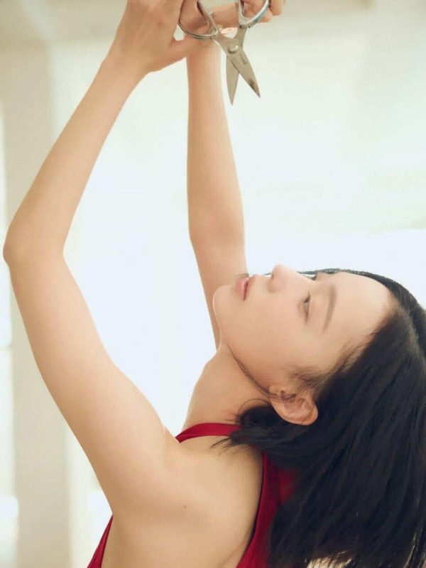 해당 사진에서 윈터는 양팔을 위로 길게 뻗으면서 손에 쥔 가위를 머리 위로 들어 올리고 있다. 가위 날이 교차된 상태로 함께 담기며, 팔 동선과 시선 방향이 한 화면 안에서 자연스럽게 이어진 구도를 만든다.