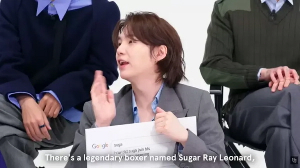 슈가는 "사실 전설적인 복서 슈거 레이 레너드의 이름에서 'R'을 빼고 가져온 것"이라며 예명의 실제 출처를 공개했다. 그는 이어 "내가 지은 게 아니라, 방PD님(방시혁)이 복싱을 좋아해서 지으셨다"고 덧붙였다.