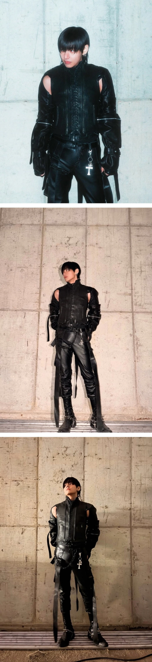 뷔는 전신을 감싸는 가죽 스타일링에 배트맨을 연상시키는 마스크를 더했다. 벽을 배경으로 한 전신 컷에서는 큰 키와 넓은 어깨, 단단한 피지컬이 강조된다.