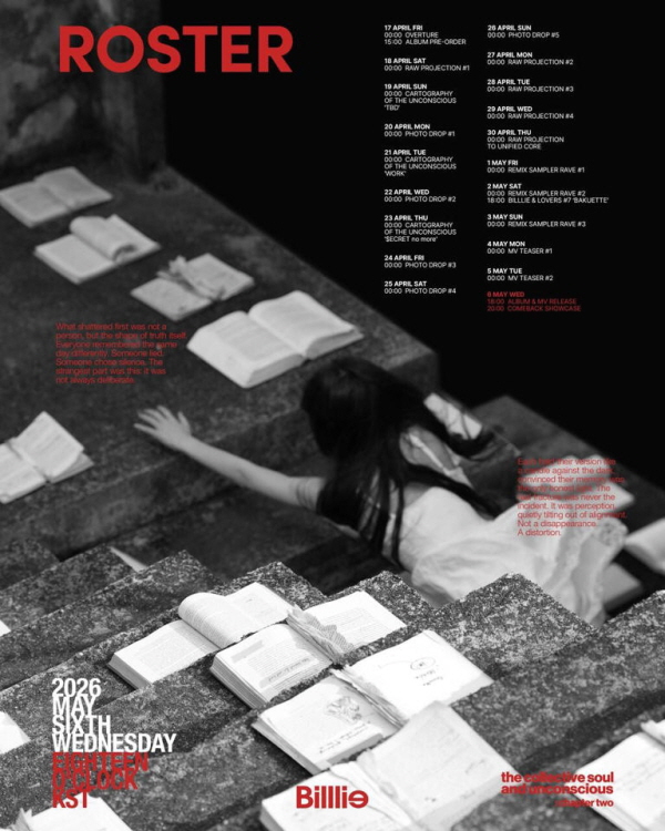 빌리(Billlie)는 16일 공식 SNS에 정규 1집 ‘the collective soul and unconscious: chapter two’의 스케줄러인 ROSTER를 게시했다. ROSTER에는 계단을 따라 펼쳐진 여러 권의 책과 일부가 찢긴 책 사이, 흰색 원피스를 입은 소녀가 다급히 손을 뻗는 모습이 더해져 의미심장한 문구와 함께 배치됐다.