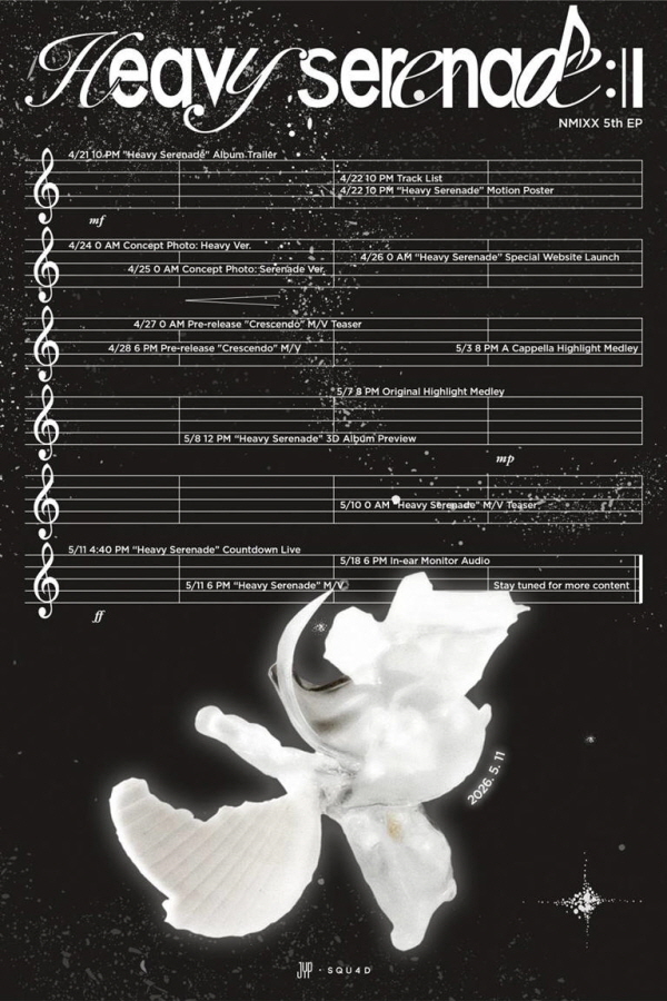 공개된 스케줄러 이미지는 '헤비 세레나데'라는 앨범명처럼 오선보와 높은음자리표, 음표, 악상기호 등이 그려졌다. 이에 따르면 엔믹스는 오는 21일 앨범 트레일러를 시작으로 22일 트랙리스트와 모션 포스터, 24일~25일 콘셉트 포토, 26일 스페셜 웹사이트, 5월 3일 아카펠라 하이라이트 메들리, 7일 오리지널 하이라이트 메들리, 8일 3D 앨범 프리뷰를 오픈한다.